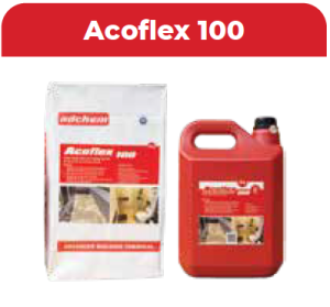 Acoflex 100 là màng chống thấm dạng lỏng 2 thành phần gốc xi măng và Polymer cải tiến với độ dãn dài khi đứt khoảng 60%, ứng dụng chống thấm các khu vực không lộ thiên, các công trình xây dựng cũ / mới.