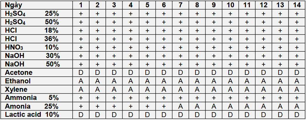 Thông số kháng hóa chất + : kháng A : xâm hại D : phá hủy