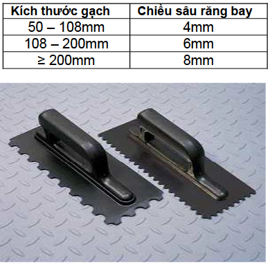 Chọn kích thước răng bay theo kích thước của gạch theo bảng hướng dẫn dưới đây: