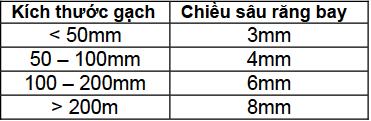 Chọn kích thước răng bay theo kích thước của gạch theo bảng hướng dẫn dưới đây: